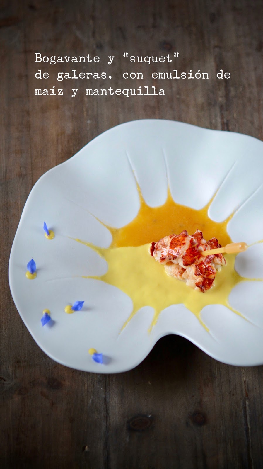 El cuerpo de un bogavante desnudo de artificios, es el protagonista de este peculiar plato en forma de Yin y Yan. Por un lado acompañado por el dulzor de una emulsión de maíz aterciopelada con mantequilla; y la contraparte la ofrece un “suquet” que he elaborado con las cabezas del bogante y unas galeras, una crema, intensa en sabor, al más puro estilo de los suquets marineros.