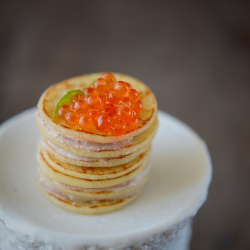 Un aperitivo formado por finas capas de blinis alternadas con una delicada crema elaborada a base de queso ricotta y sardina ahumada. En la parte superior unas huevas de trucha y hojas de albahaca fresca. Este aperitivo también lo podemos hacer con anguila ahumada o trucha ahumada. Lo he servido en forma de mini torres, que se degustan de un bocado, dado que los blinis son pequeñitos. Un bocado que se come con las manos.