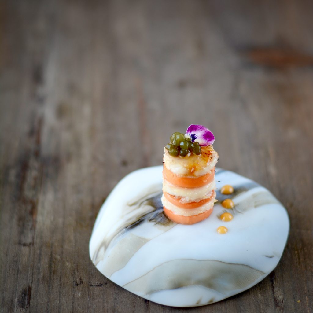Un aperitivo refrescante y original que combina, alternando capas, la papaya al natural con la anguila ahumada. Caramelizamos, con azúcar quemada, la última capa de anguila para aportarle un punto de dulzor que contrasta ligeramente con el punto asiático que le proporciona la salsa hecha sobre una base de cacahuete, soja y mirin.