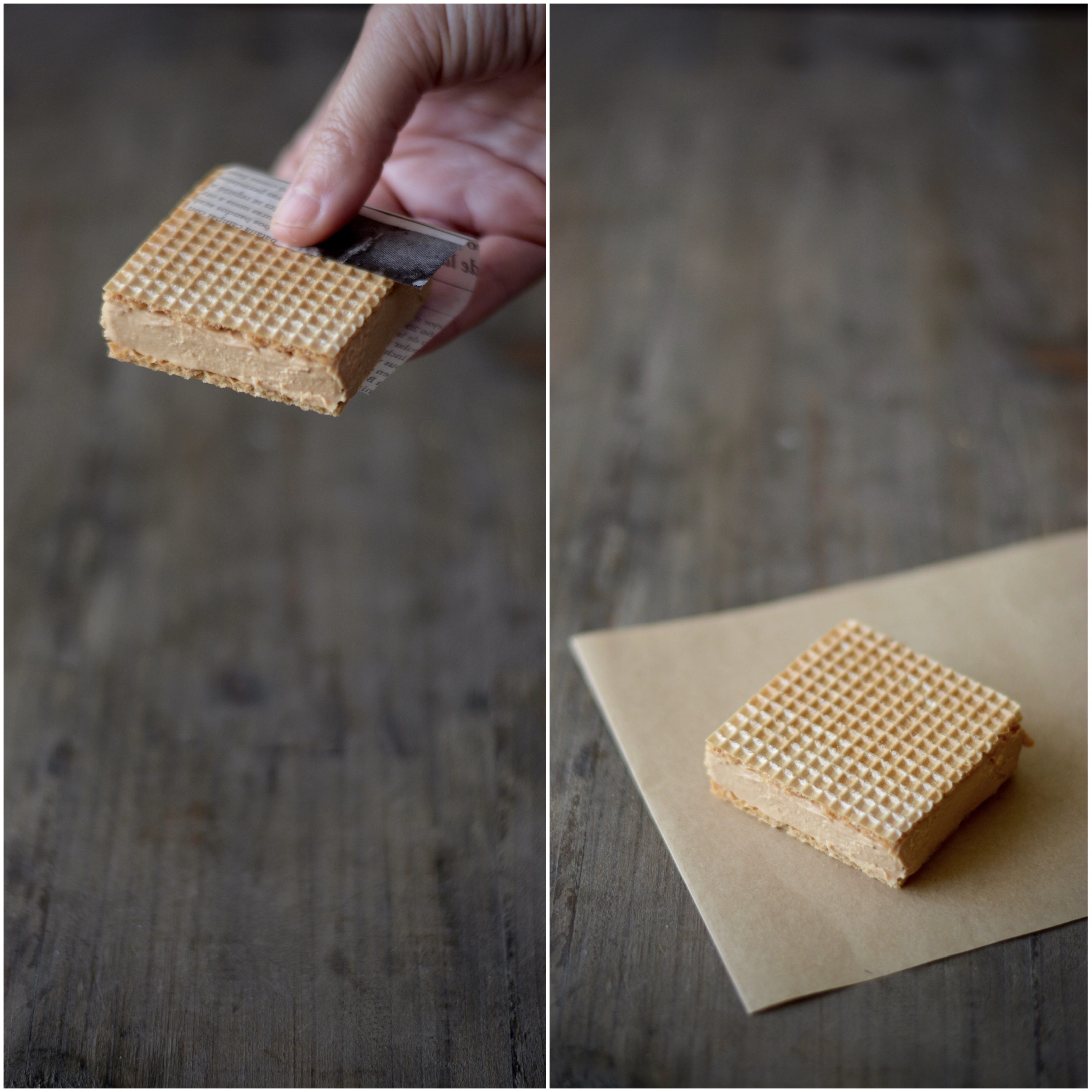 Transcurrido el tiempo, retiramos del congelador y extraemos el helado salado (tirando del papel film). Cortamos del mismo tamaño que las obleas de galleta.