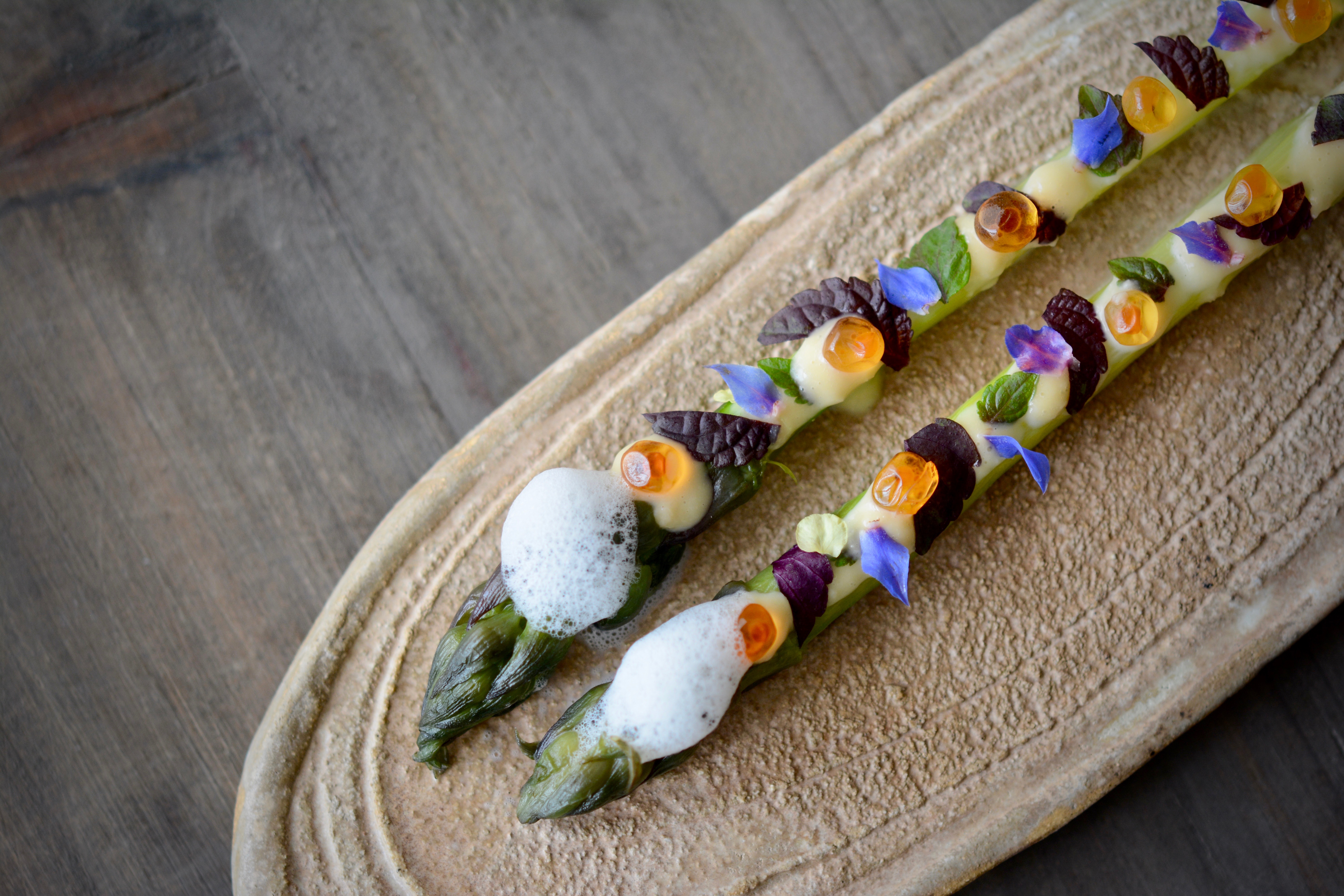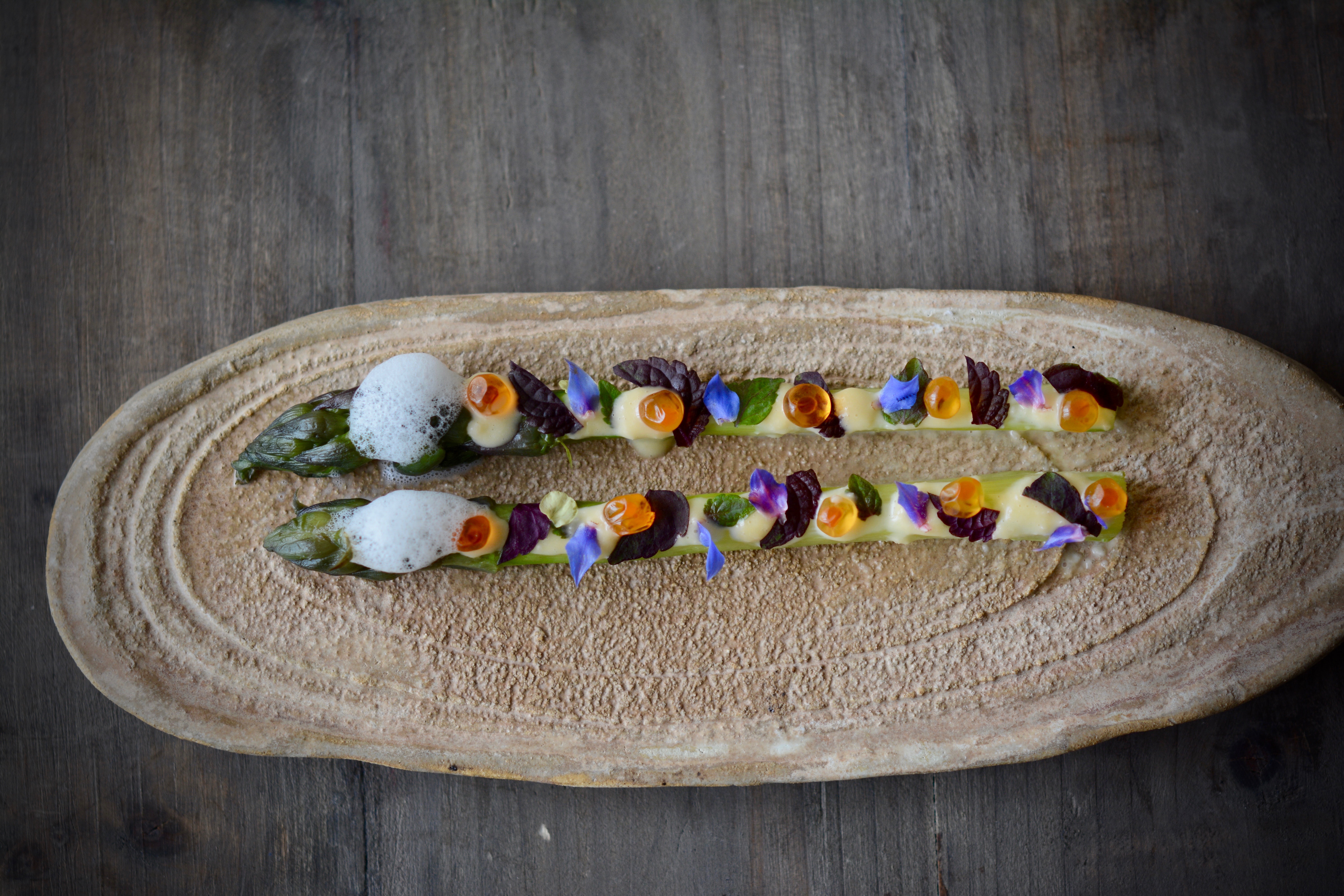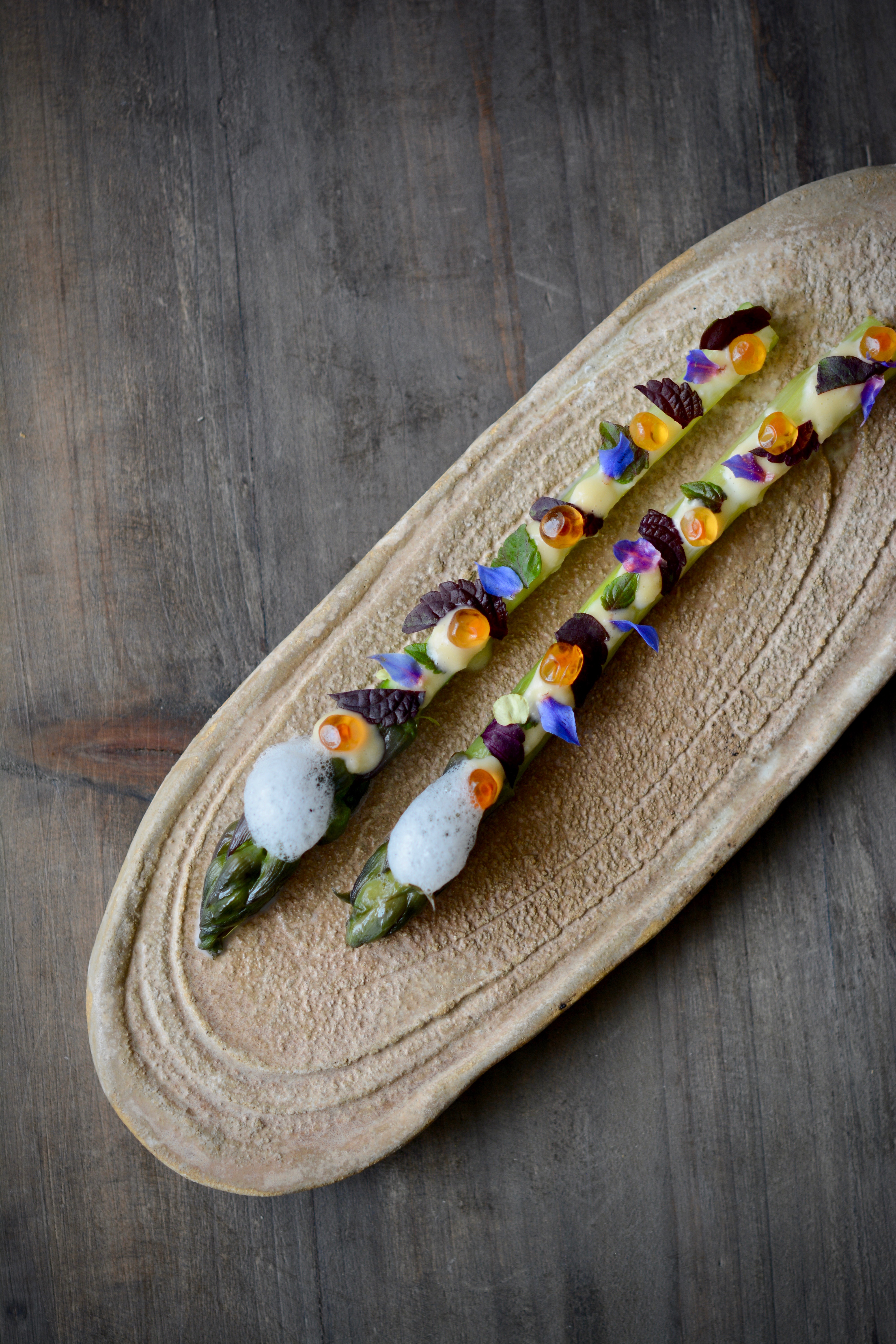 “EL” espárrago. Más allá de su belleza, el sabor le supera. Los sabores y aromas cítricos predominan en este bocado: un aire elaborado con hojas de lima kaffir, los kumquats incorporados a la salsa beurre blanc y las hojas de shiso nos van a aportar un punto cítrico que combina de maravilla con la untuosa mantequilla y las huevas de salmón.