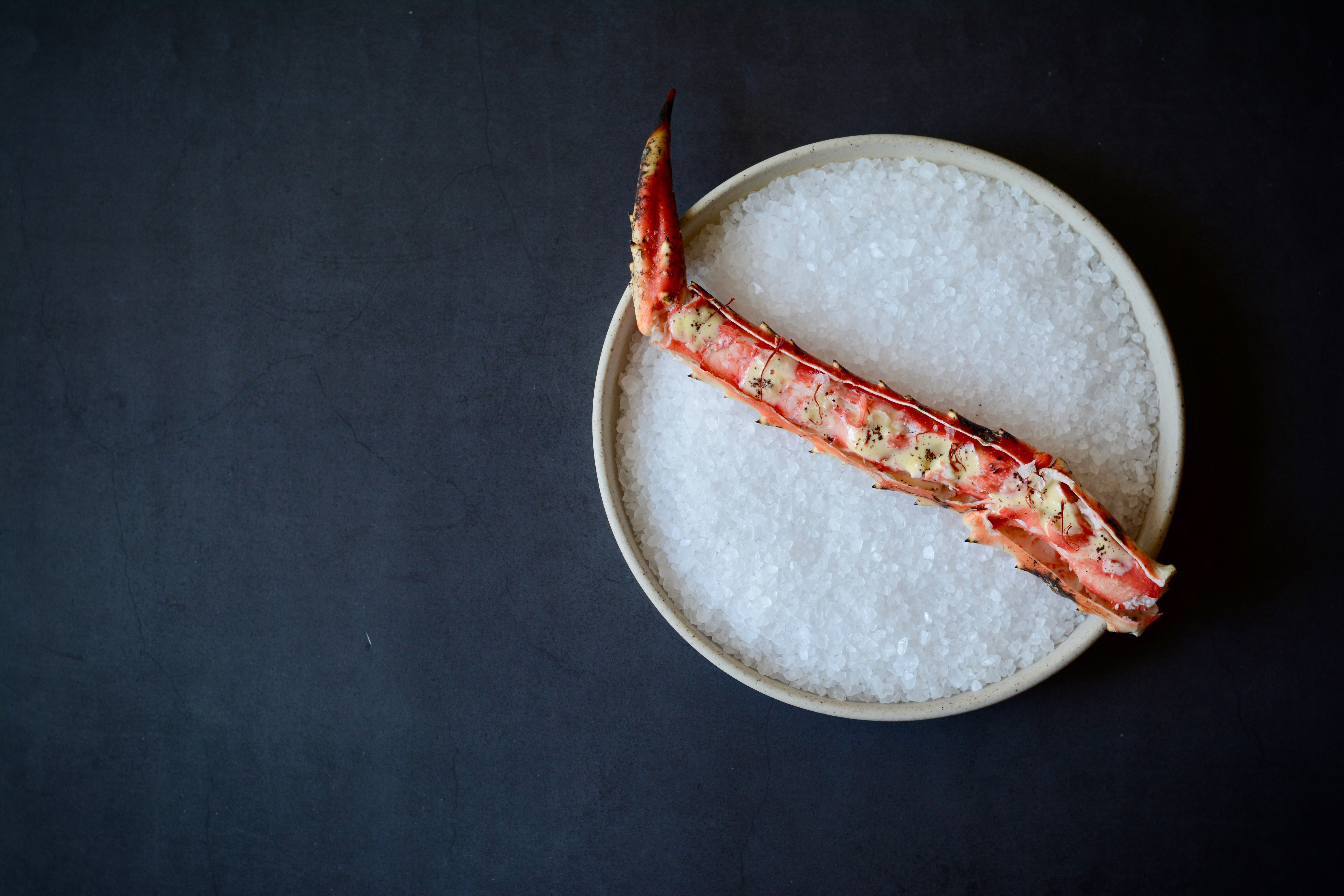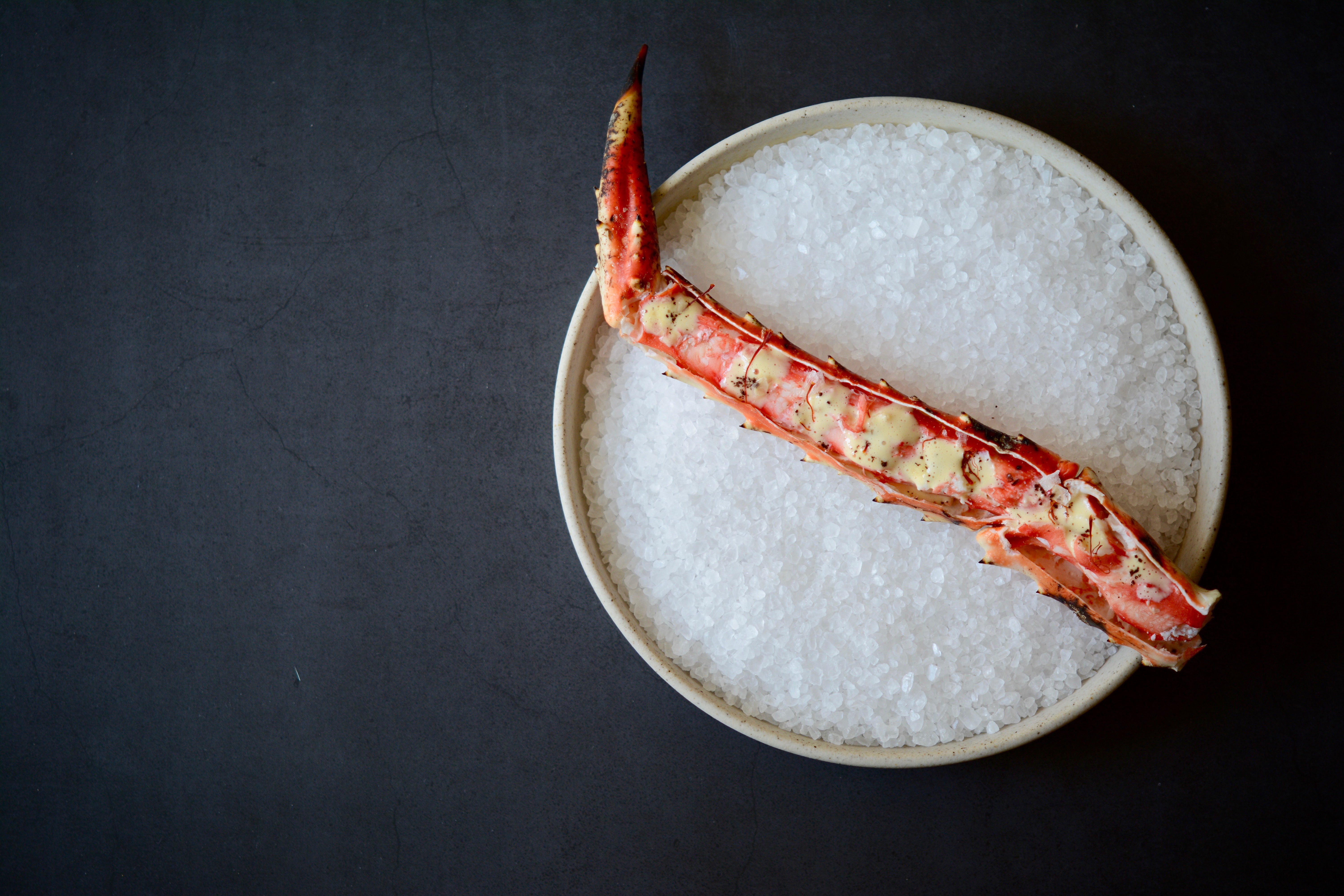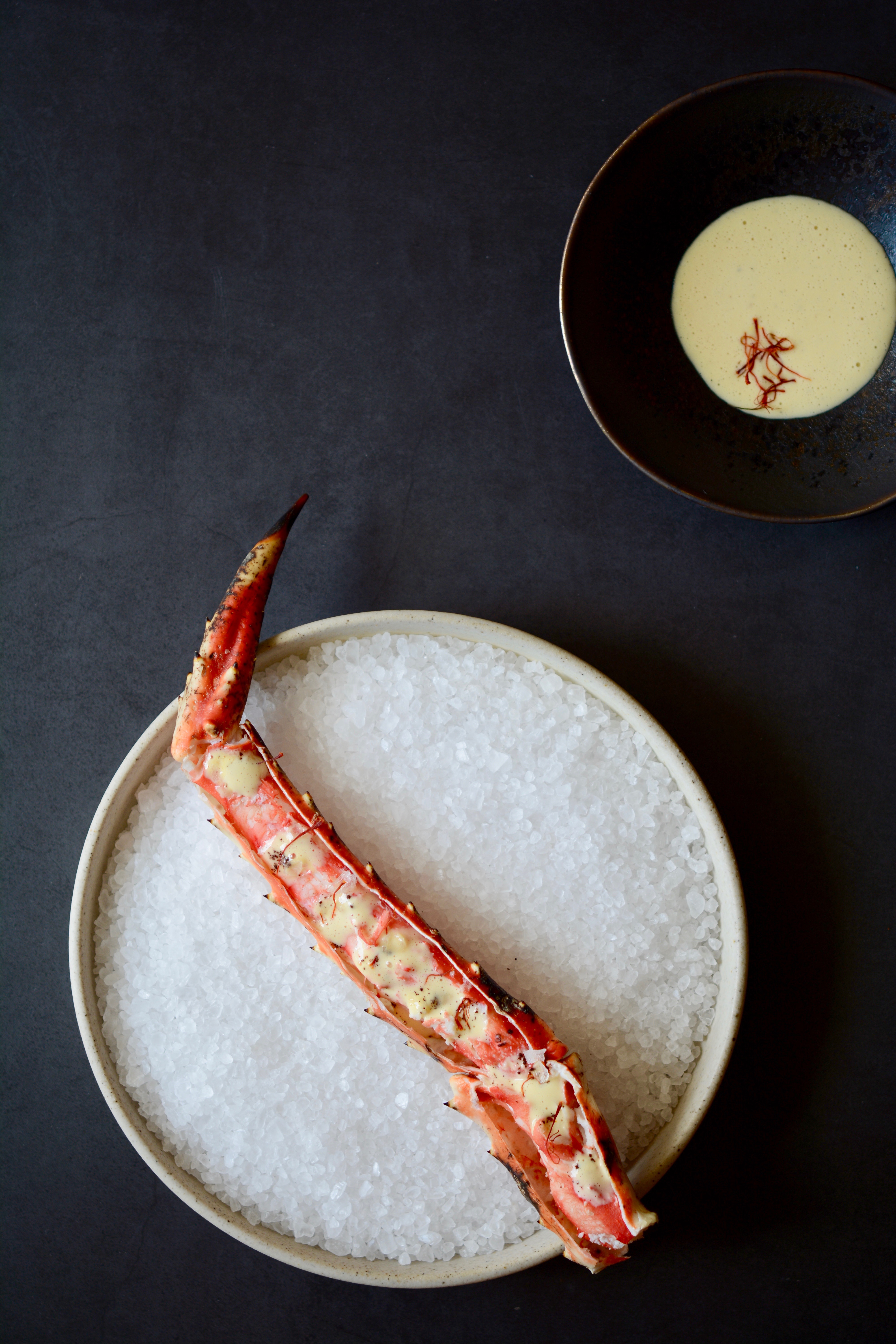 Para abrir boca, una pata de cangrejo real cocida, servida bien fría y aliñada con una salsa beurre blanc, elaborada a base de mantequilla, vino blanco, unas hebras de azafrán y semillas de vainilla.
