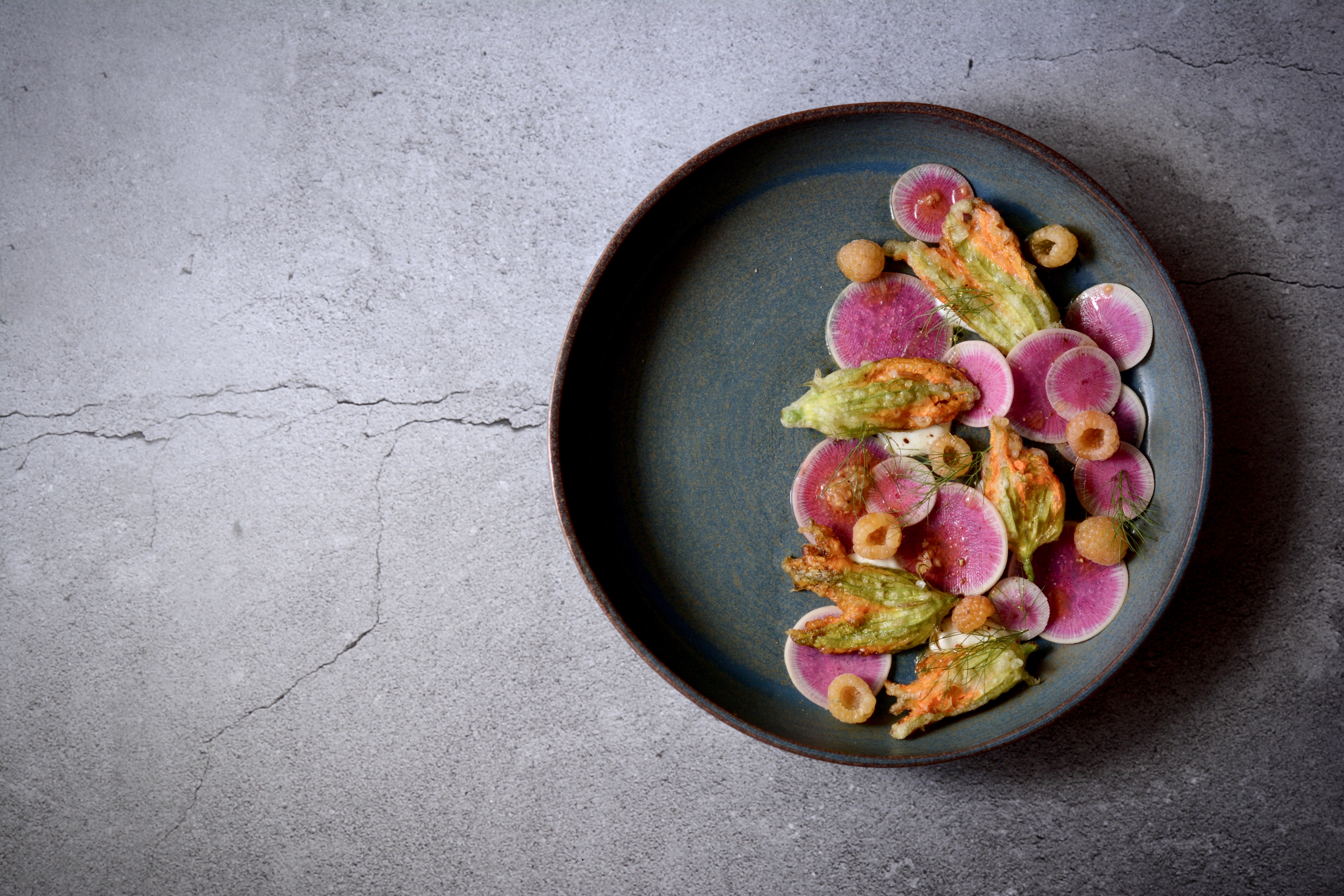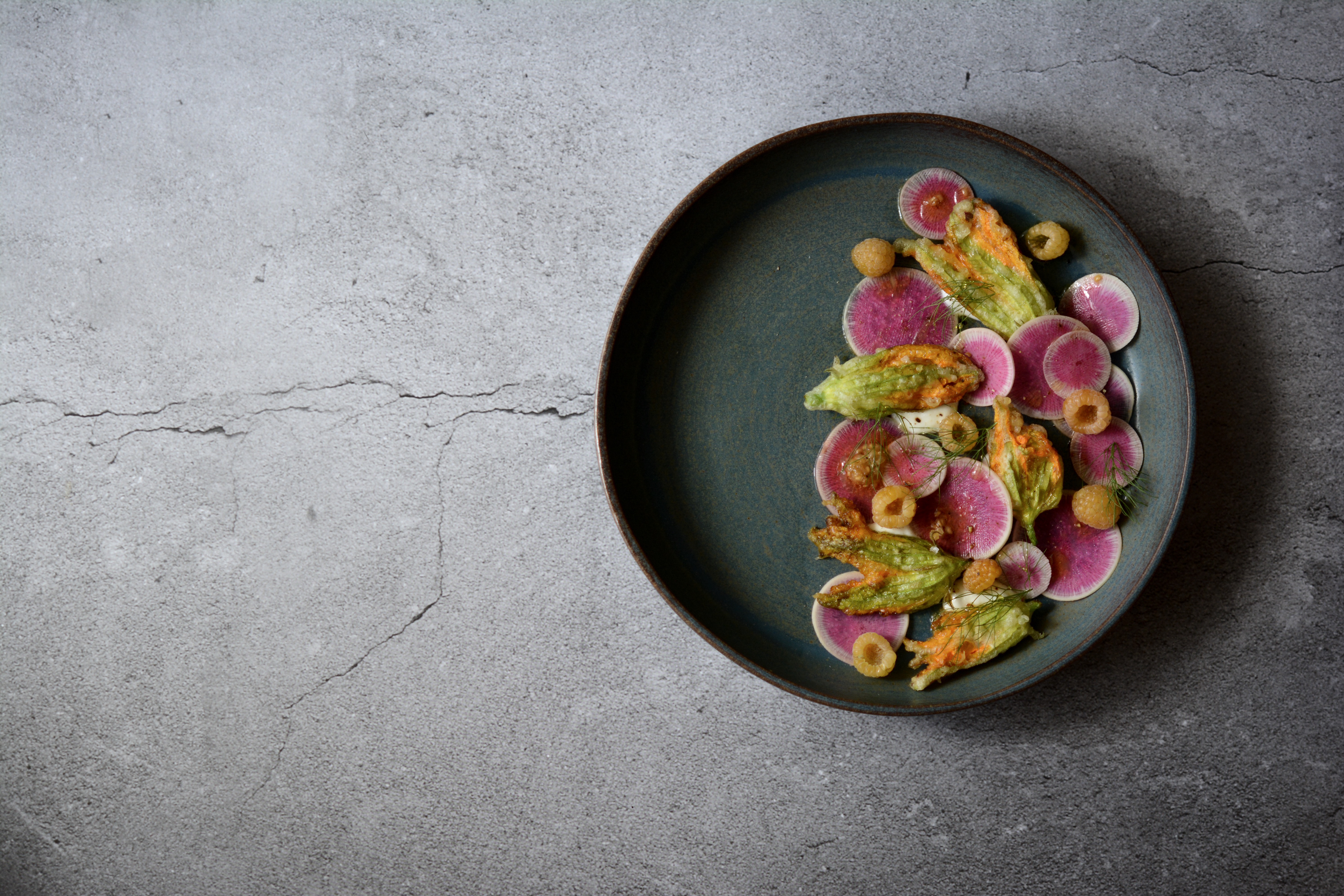 Montamos la ensalada, para ello depositamos pequeños montoncitos de brandada de bacalao (con ayuda de la manga pastelera); sobre ésta depositamos las flores de calabacín en tempura. Intercalamos las rodajas de rábano picante y hebras de eneldo fresco. Aliñamos con la vinagreta, depositamos unas frambuesas amarillas enteras y finalmente salamos con escamas de sal y pimienta. Degustamos de inmediato.