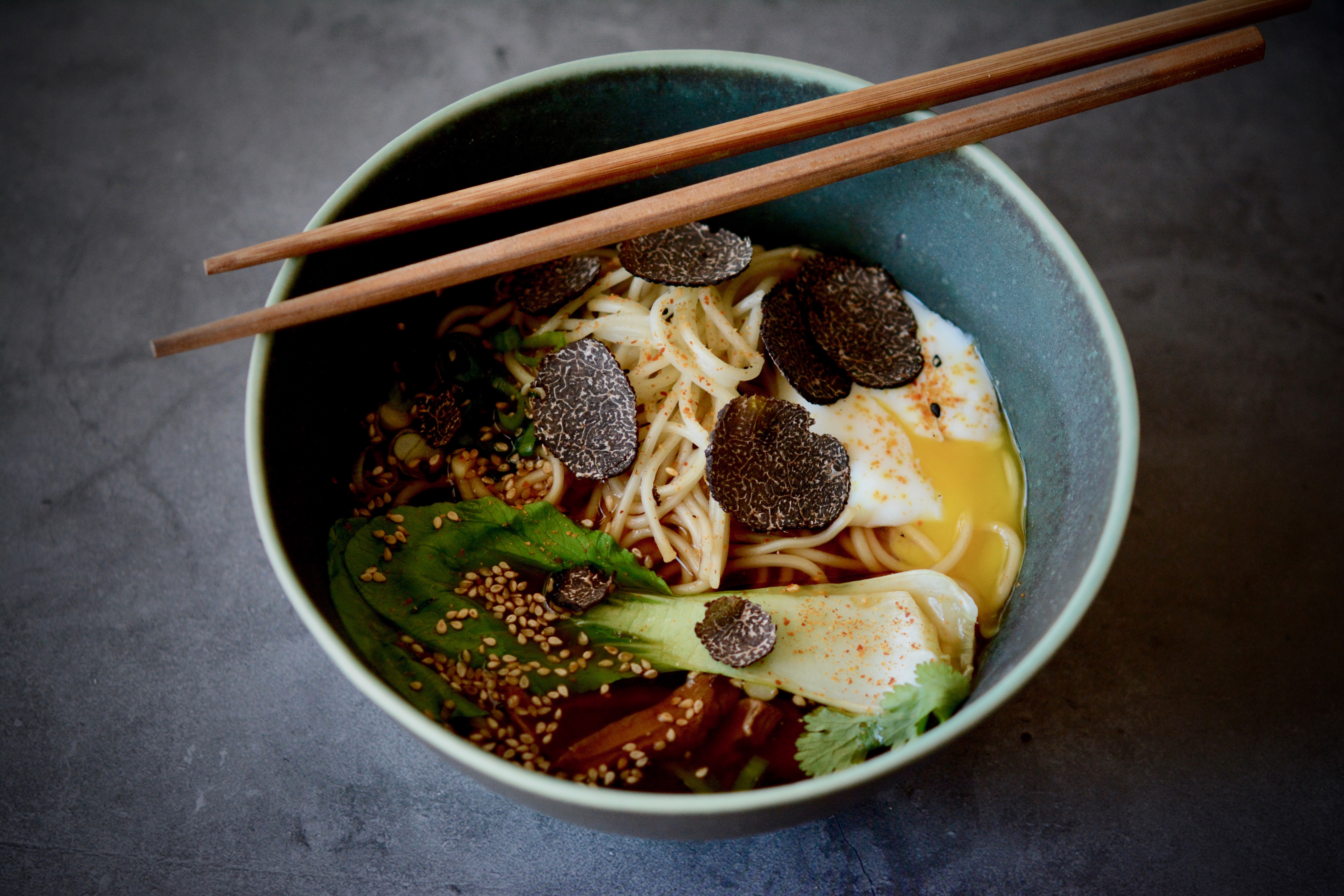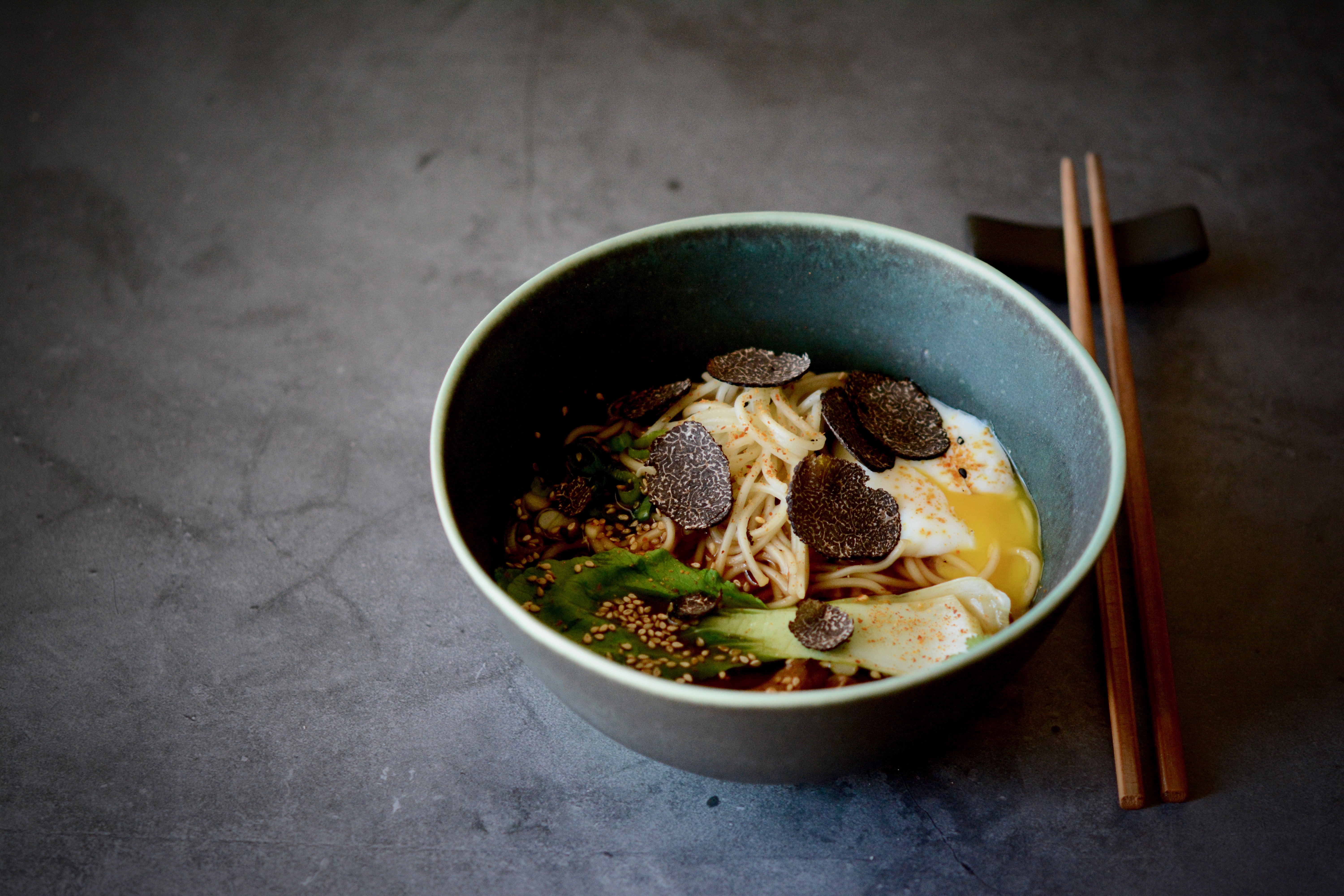 He querido elaborar un ramen con trufa fresca negra para inaugurar la temporada de trufa, y con la idea de ofrecer un primer plato para estas fechas navideñas, distinto, sabroso y festivo. La base la he elaborado con un caldo vegetal, boletus deshidratados, alga y jengibre; con un punto picante de la pasta de chile fermentado y un poco de miso blanco.
