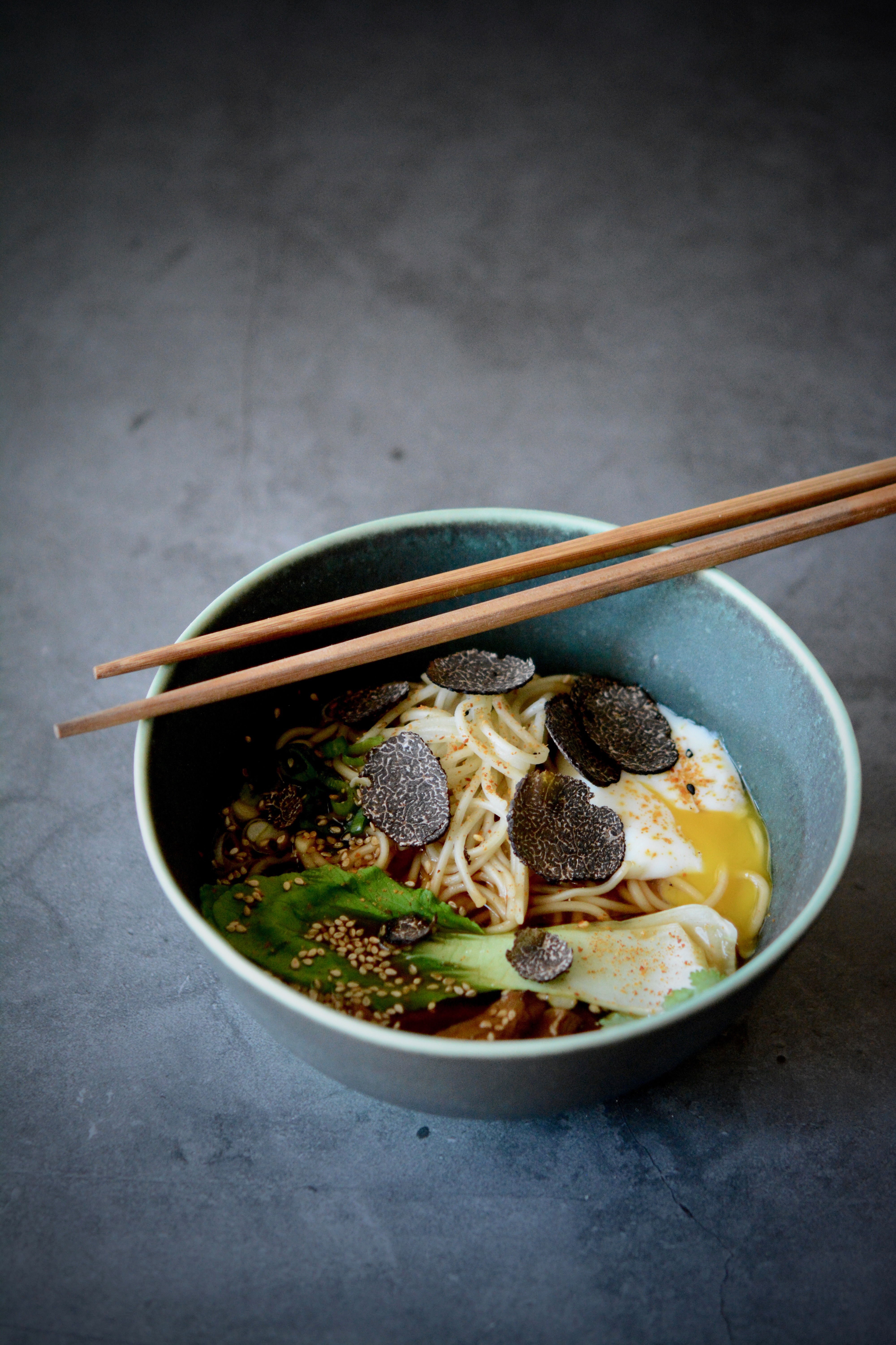 El principal condimento de este ramen, al margen de sus habituales fideos ramen, son unos huevos a baja temperatura que previamente he aromatizado con trufa durante unos días.