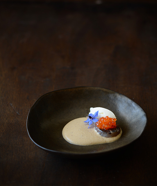 Pulpo seco con miso y sésamo negro / bizcocho s...