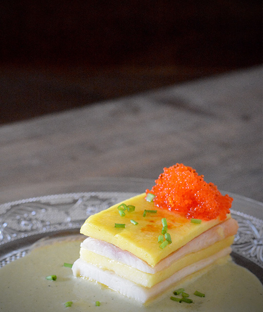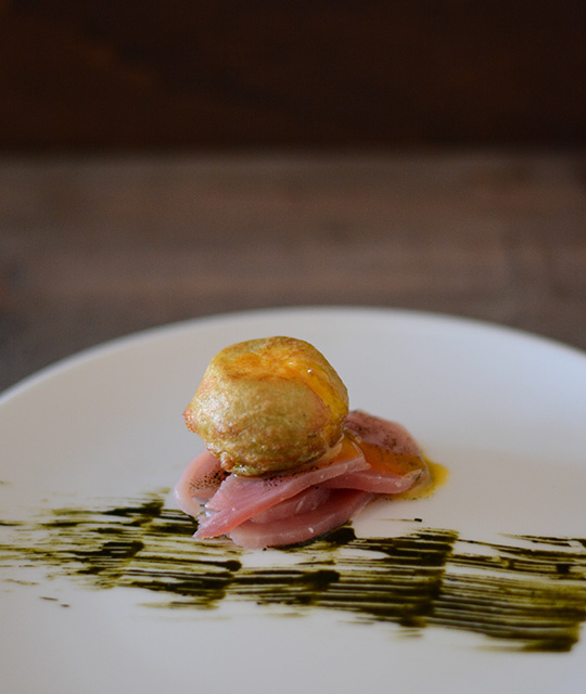 Parmentier de coliflor con erizo de mar y espárragos ...