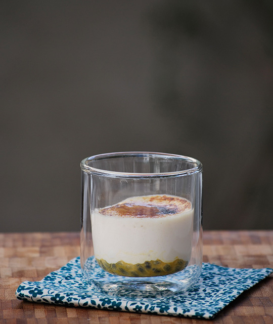 Mousse de foie con azúcar quemada y fruta de la pasión. ...