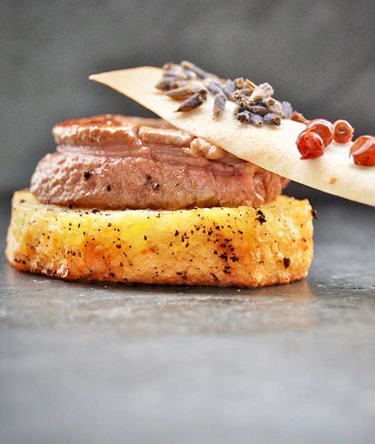 Patata con vainilla de Tahití bajo solomillo trufado, teja de lavanda ...