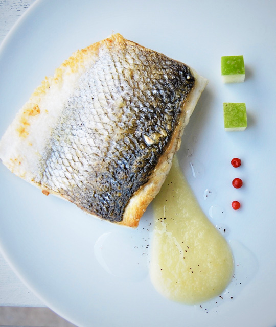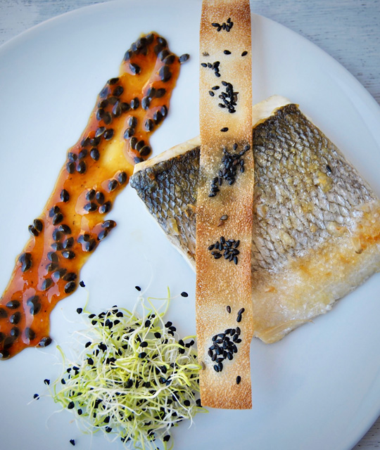Lubina con salsa de fruta de la pasión y teja de sésamo negro. ...